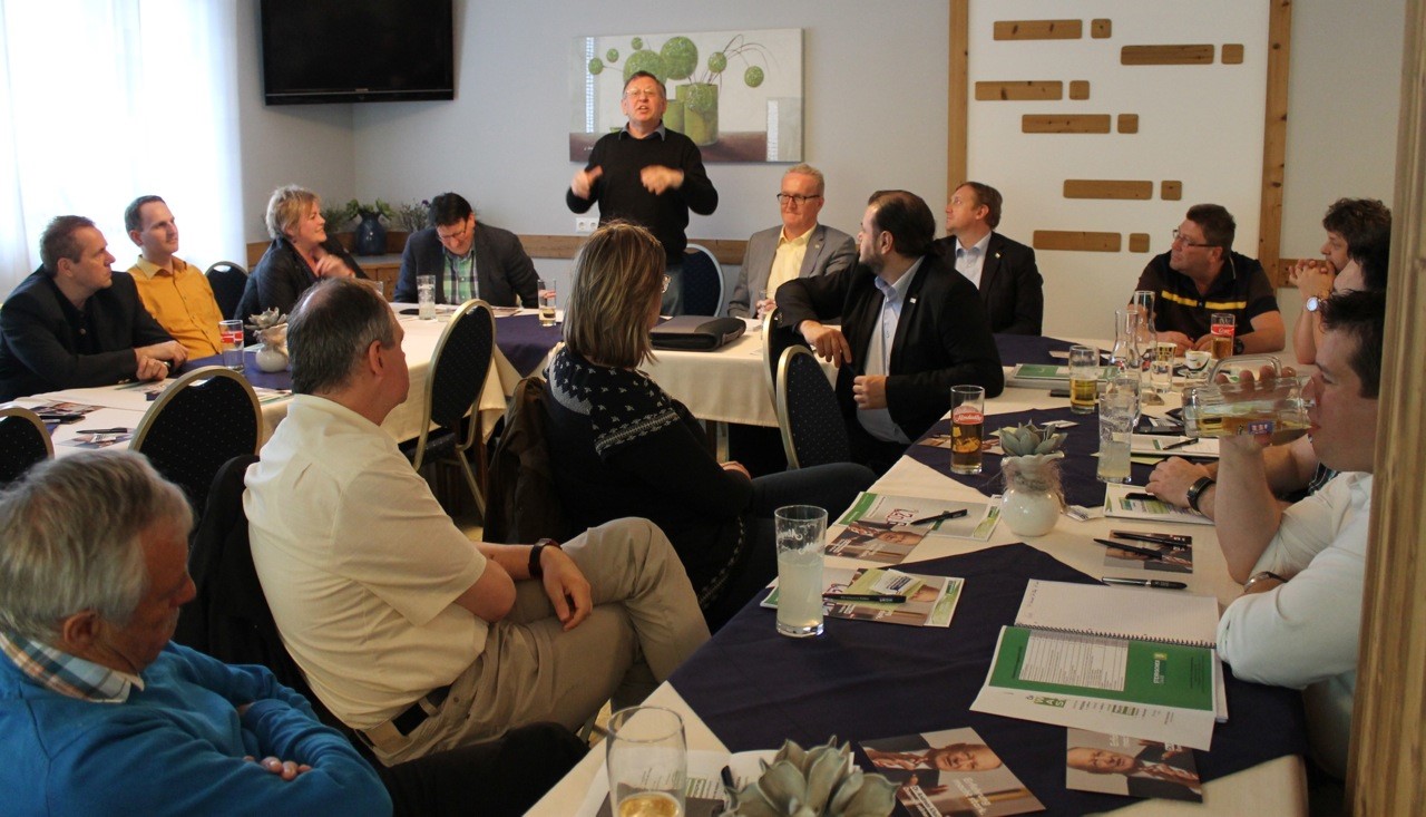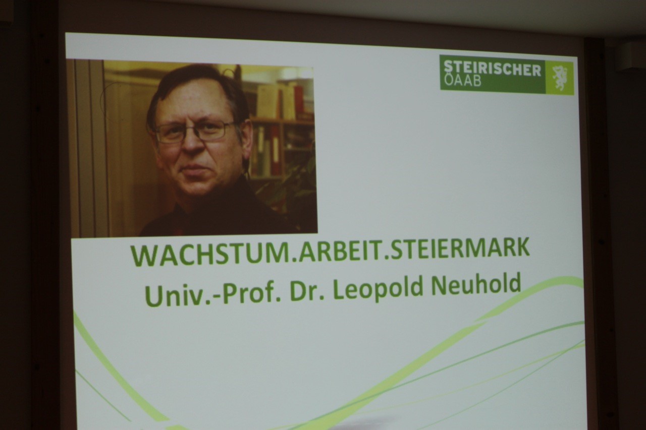 ÖAAB Bezirksobmann Vizepräs. Franz Gosch konnte bei der Bezirkskonferenz zwei prominente Referenten begrüßen. Zum einen Univ.Prof. Dr. Leopold Neuhold, der über das Thema „Wachstum.Arbeit.Steiermark“ sprach und in seinen Ausführungen viele neue Aspekte mit praktischen Beispielen einbrachte, wie sich der ÖAAB in der heutigen schnellebigen Zeit besser positionieren kann.