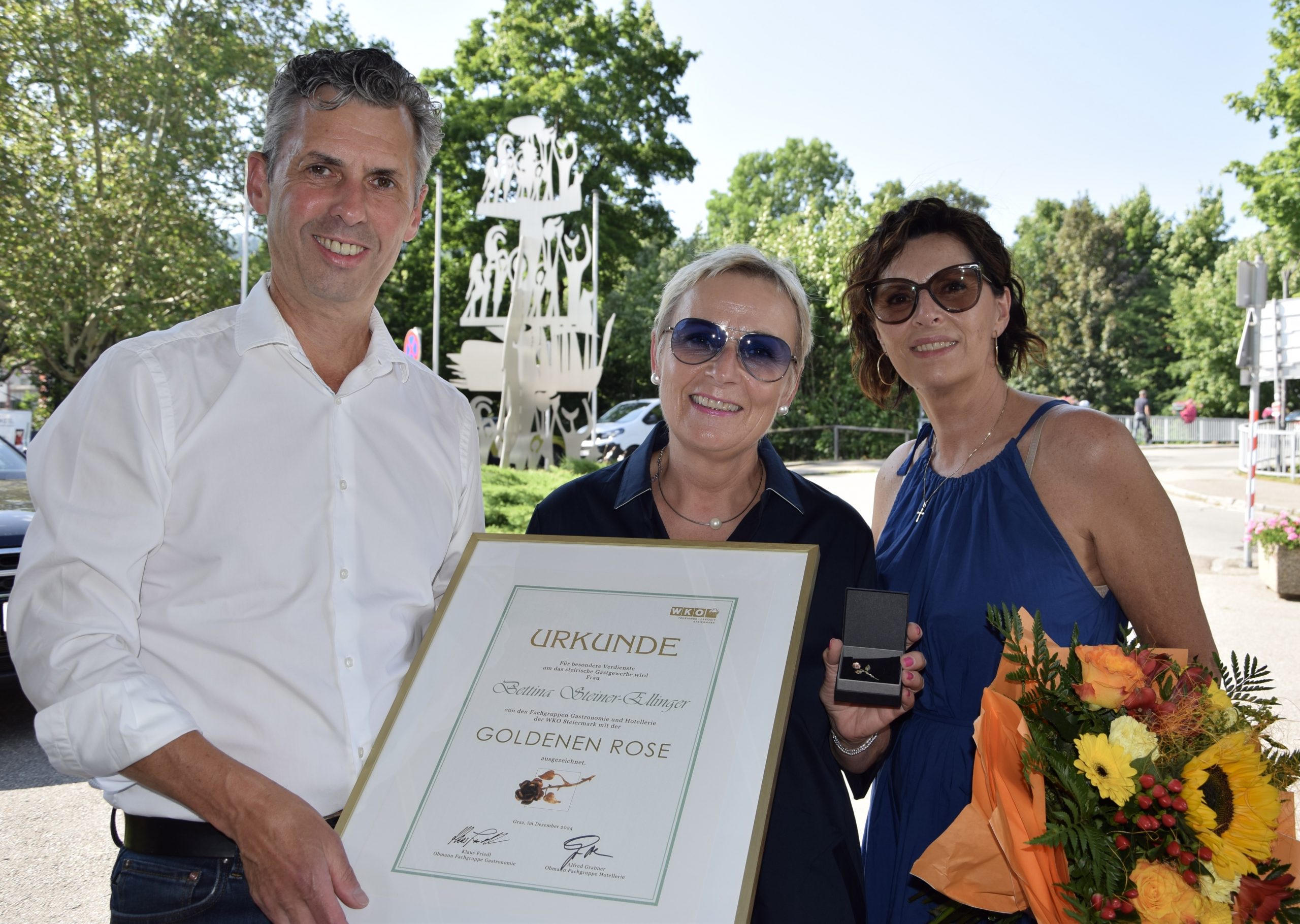 Nun erhielt Bettina Steiner-Ellinger für ihre besonderen Verdienste von Alfred Grabner – Obmann der Fachgruppe Hotellerie der WK – gemeinsam mit LAbg. Cornelia Izzo im Sporthotel Kapfenberg die Urkunde mit der „Goldenen Rose“. Gratulation.